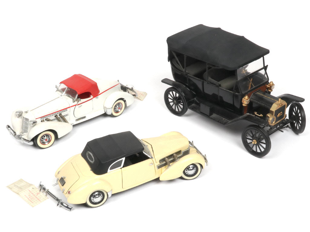 échelle : 1/24ème - comprend : CORD 812 1937, AUBURN 1935 & FORD T - quelques éléments cassés & manquants - encrassé