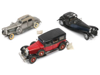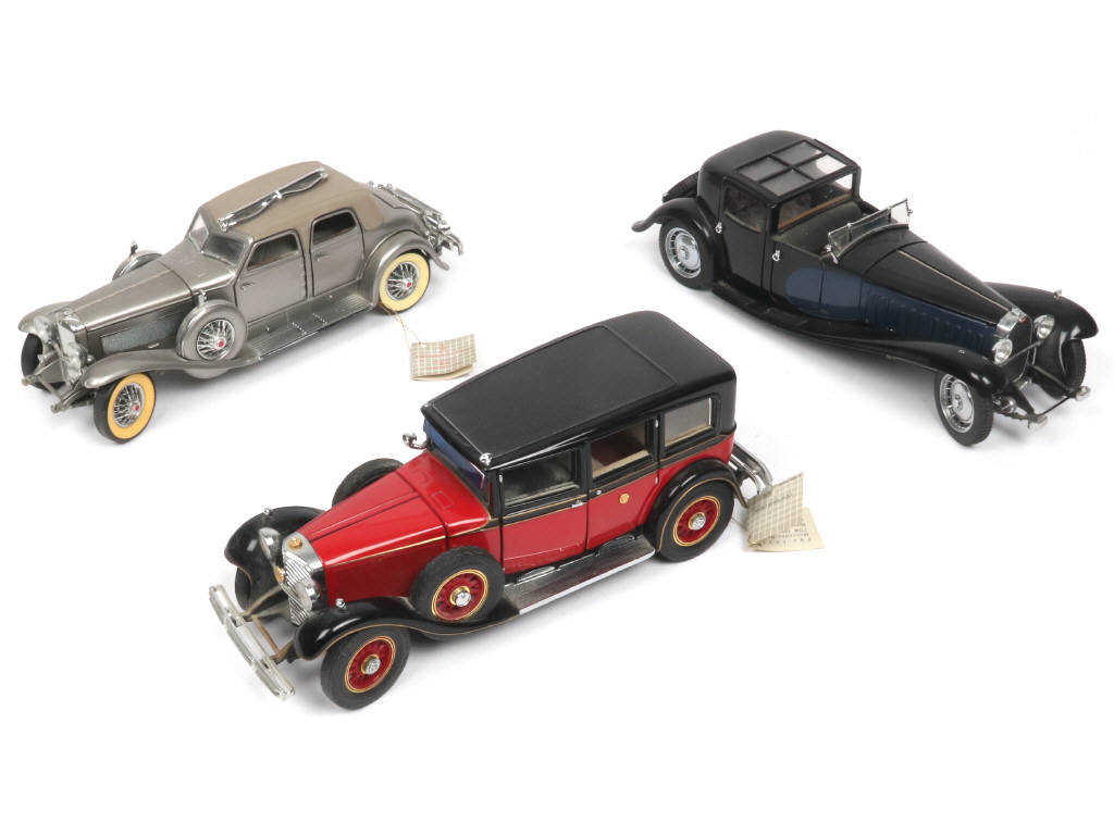 échelle : 1/24ème - miniatures reproduisants les modèles : MERCEDES, DUESENBERG & BUGATTI - encrassé - quelques petits accessoires cassées (dont une fixation de roue) & manquants