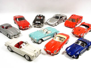 échelle 1/18ème - états de 'A' à 'B' - comprend : 2 MERCEDES, 2 FERRARI, une LANCIA, une JAGUAR, une PORSCHE, une LAMBORGHINI, une AC COBRA & une CHEVROLET - on y retrouve les marques : BBURAGO, MAÏSTO, POLISTIL & KYOSHO - petits manques