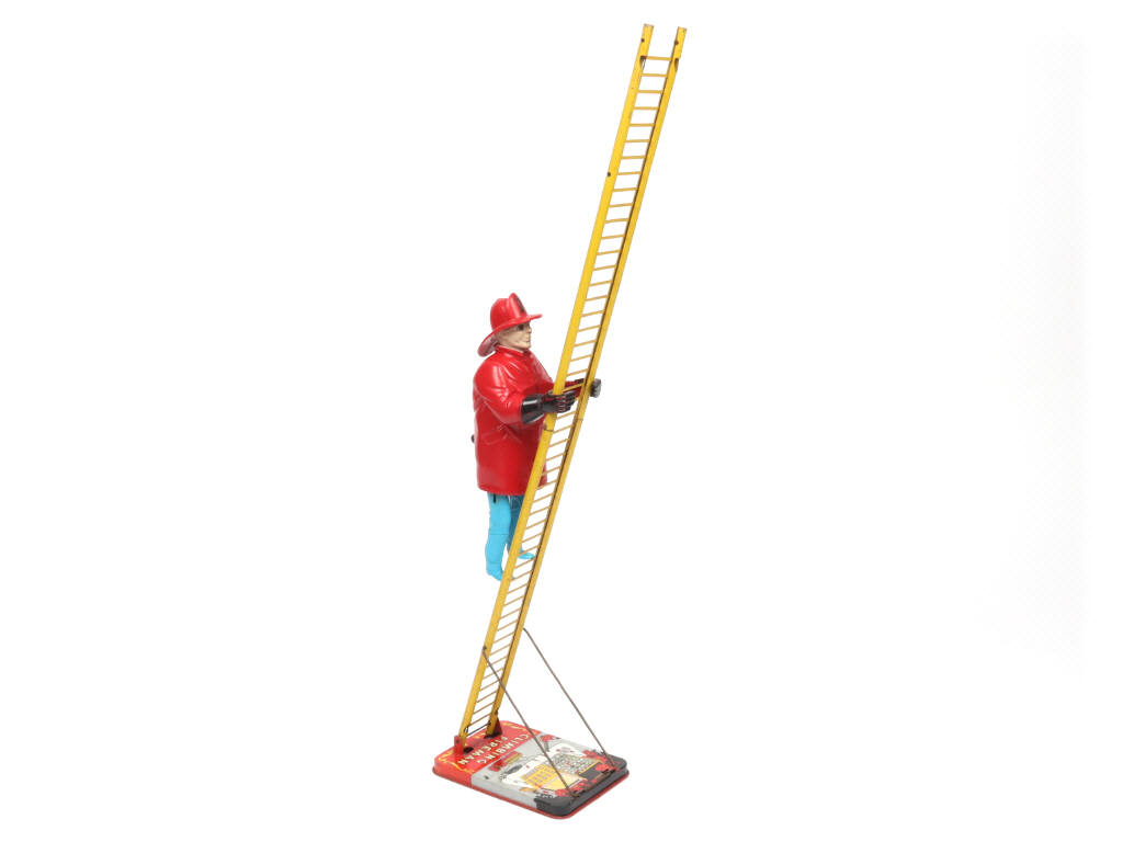 hauteur de l'ensemble 55 cm - moteur à ressort fonctionne - en action, le pompier monte à l'échelle