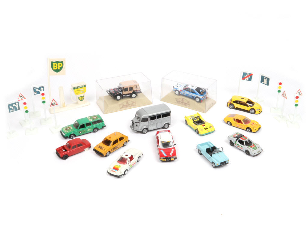 comprend les modèles : CITROEN; PEUGEOT, LIGIER & VOLKSWAGEN - avec manques & parties cassées - on y joint une peugeot 204 avec marquage 'BONUX' & 13 accessoires en plastique