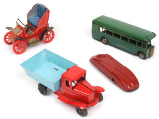 on y retrouve notamment les marques : TRIANG MINIC (petits manques, petites restaurations, pneus non d'origine sur l'autobus) & MASUDAYA - 3 exemplaires motorisés (fonctionnent)
