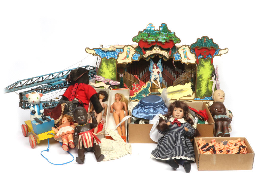 Lot divers comprenant poupée BARBIE – micro baigneurs – jouet à tirer xylophone – orgue de foire et grue CHR.