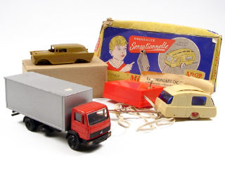 il s'agit du coffret petit modèle non doté d'automobile - la caravane motorisée peut s'adapter entre autres, sur une voiture C.I.J.- avec un boîtier de commande pour téléguidage & notice portant la mention 'OSCAR DU JOUET 1958' - small boxset not including the car - the motorised caravan can be attached to, among other things, a C.I.J. car - with a hand-held control box & leaflet with the inscription 'OSCAR DU JOUET 1958'