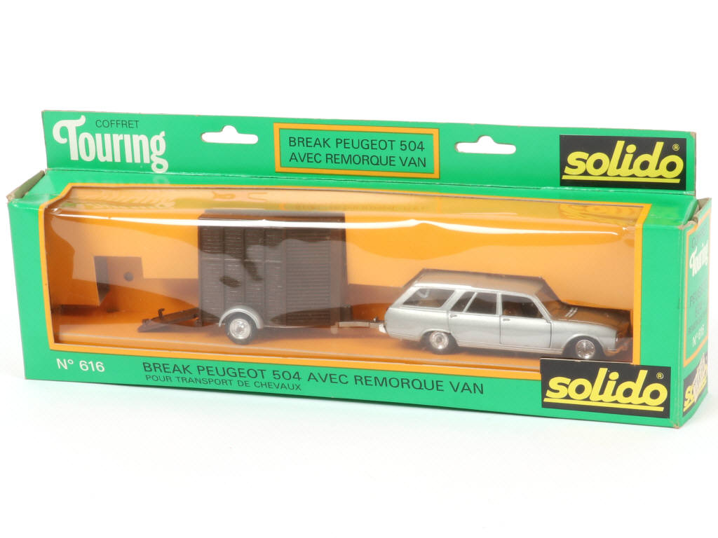 contient : PEUGEOT 504 break & remorque-van THEAULT avec cheval - quelques accrocs sur la boîte
