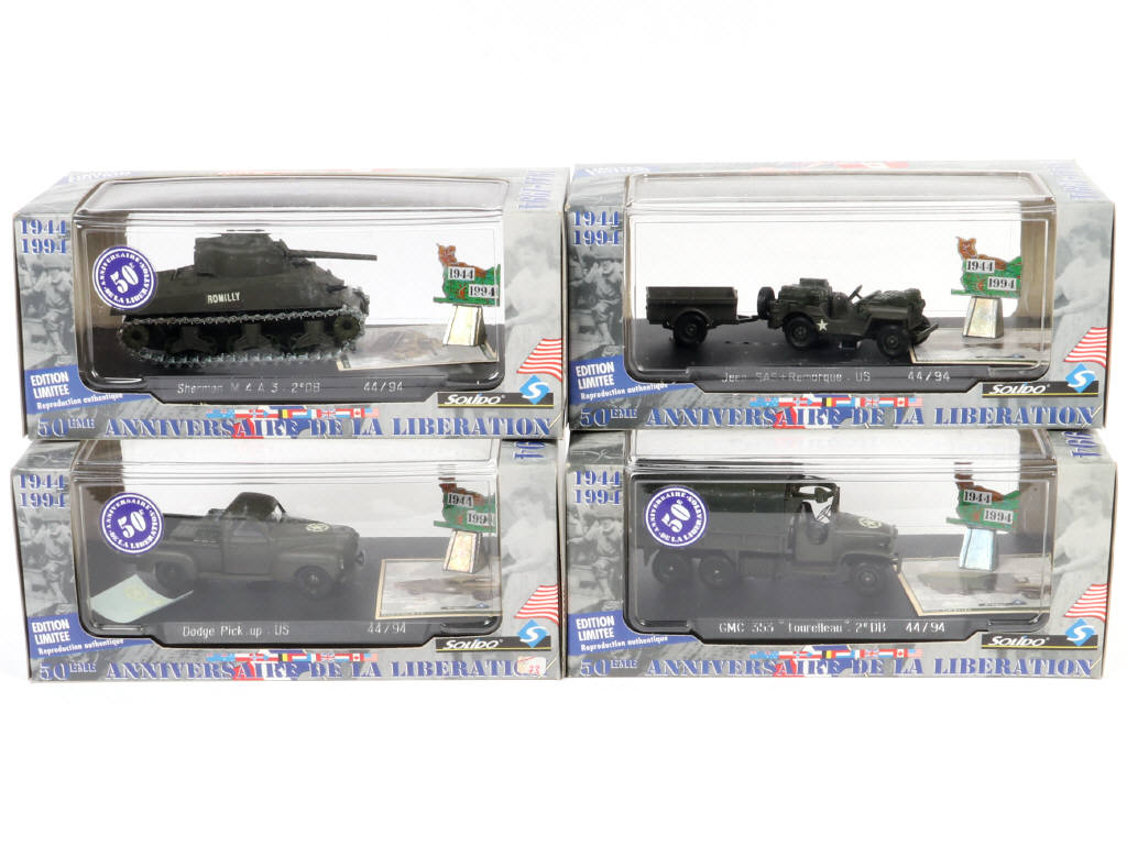 SOLIDO (FRANCE) Ensemble de 4 véhicules militaires & une remorque