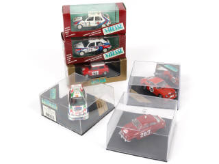 miniatures reproduisant les modèles : LANCIA, PORSCHE, TOYOTA & MORRIS - on y joint uune SAAB de la marque TROFEU