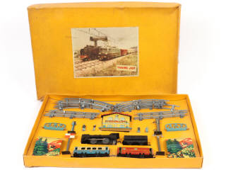 complet - fabrication en plastique & métal - dimensions du coffret : 60 x 38 cm - contient : locomotive à vapeur avec tender (moteur à clef fonctionnel), voiture-voyageurs 'PULLMAN', un fourgon postal & différents accessoires