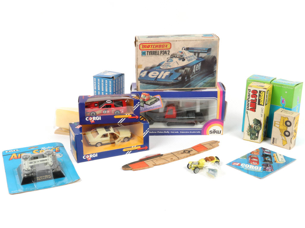 comprend notamment les modèles : BUGATTI, TYRRELL, CHEVROLET & MERCEDES - comprend les marques : MATCHBOX, AUTO REPLICAS, CORGI & ERTL - boites sont en états 'b' à 'c' - on y joint 4 boites vides des marques : SIKU, ELIGOR, SOLIDO & NZG