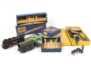 non testé - comprend notamment : locomotive à vapeur, quai, passage à niveaux, pièces pour construction, clef & moteur - on y retrouve notamment les marques : HORNBY, SOLIDO, MECCANO & JEP - avec manques & parties cassées