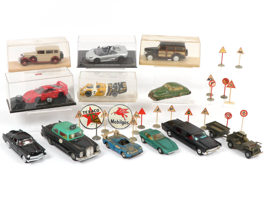 On y retrouve notamment les marques : CORGI & HERPA - entre autres les modèles : RENAULT ALPINE A440 & INDRA - on y joint un ensemble de panneaux routier - manques ou parties cassées sur certains véhicules - un modèle repeint