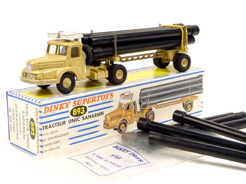 DINKY TOYS (FRANCE) 893 UNIC Saharien transport de pipe-lines (version avec jantes convexes & remorque ajourée) sable & blanc