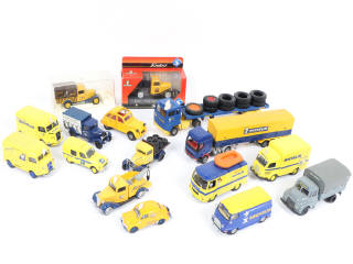 comprend les modèles : CITROËN, RENAULT & PEUGEOT - petits éléments cassés & manquants - on y retrouve les marques NOREV, MAJORETTE & CORGI - 2 modèles en boites en état 'b'
