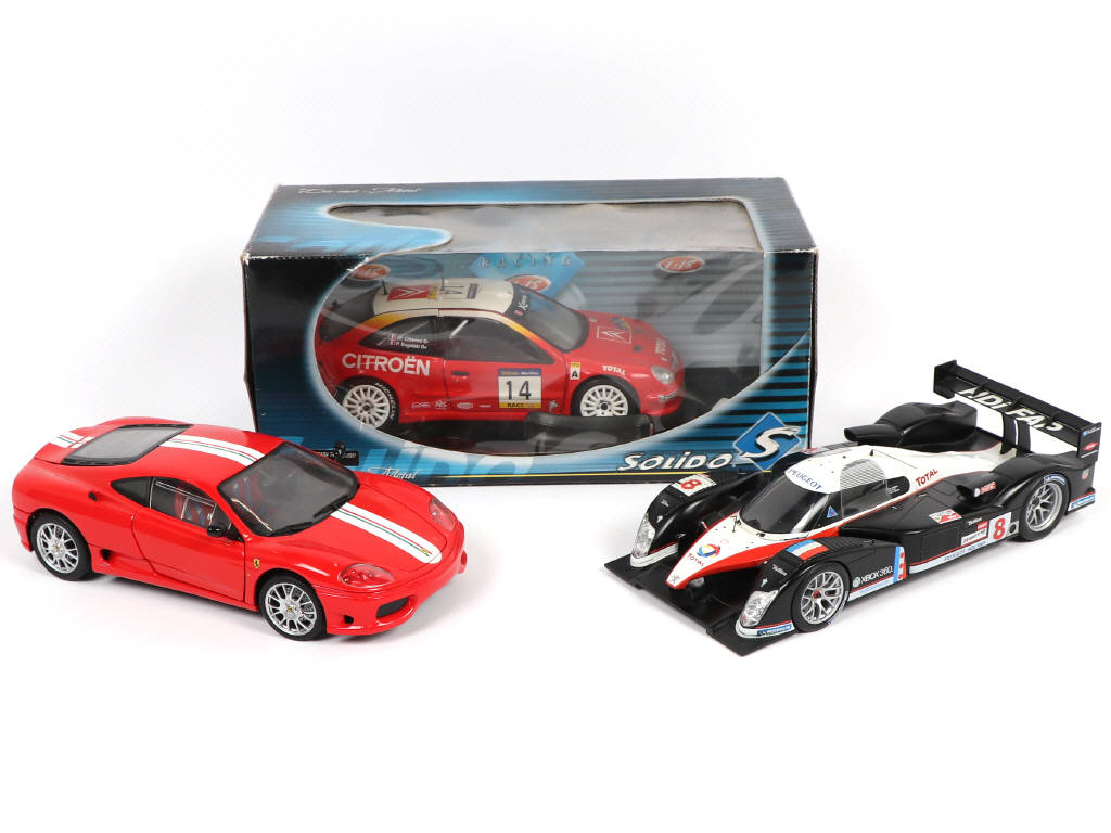 échelle 1/18ème - comprend les modéles : CITROËN, PEUGEOT & FERRARI - on y retrouve les marques : SOLIDO, NOREV & MATTEL - petits éléments cassé & manquants - boite état d