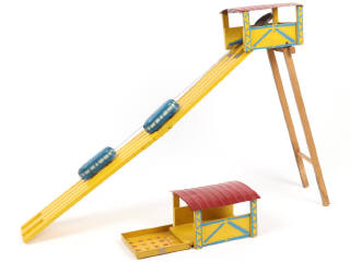 2ème version de 1956 - dimensions : 90 x 40 cm - mouvement à billes faisant monter & descendre simultanément les 2 cabines - sans bille - quelques déformations