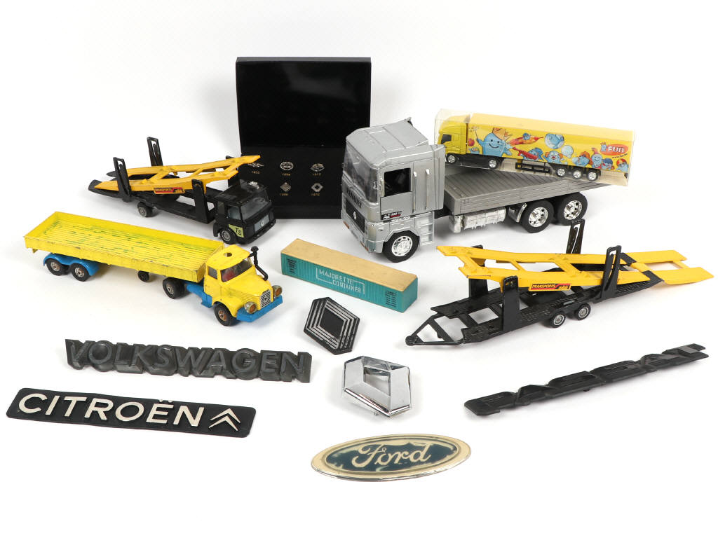 comprend les modèles : RENAULT, BERLIET & IVECO - avec petits manques & parties cassées - on y retrouves les marques : MAJORETTE, SOLIDO & CORGI TOYS - on y joint 5 insignes divers & un coffret de 8 pin's RENAULT