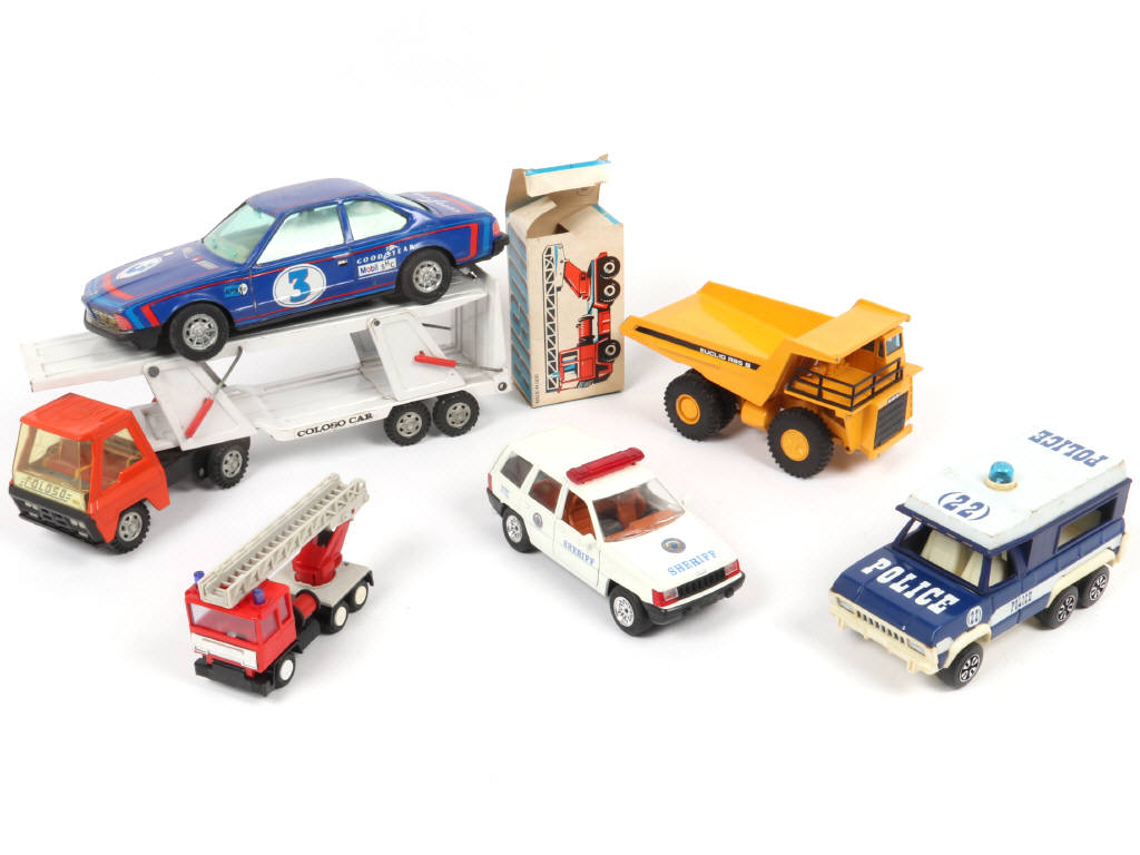 différentes compositions - 2 modèles avec moteurs à friction (fonctionnels) - on y retrouve notamment les marques : JOUSTRA, MAJORETTE, GOZAN & JOAL - possibilité de petits manques
