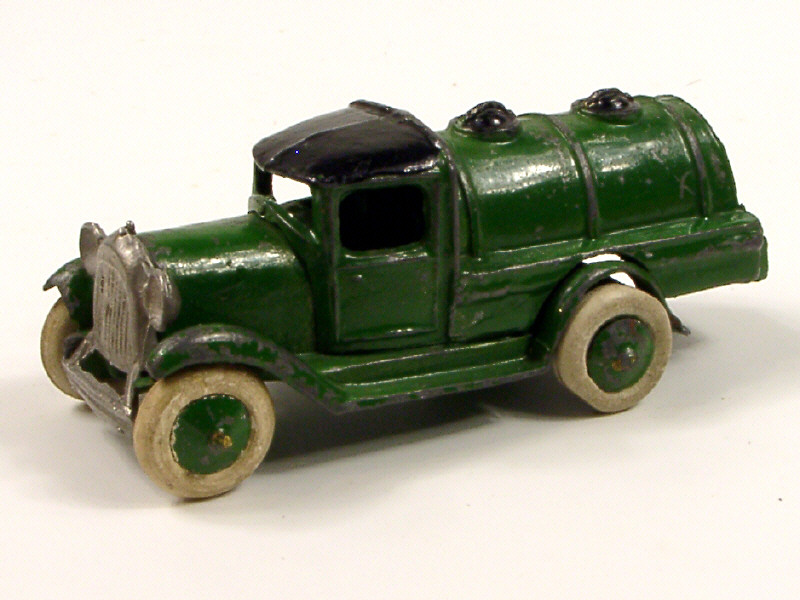 production en plomb de 1930 - grille de calandre, phares & pare-chocs rapportés - version avec pneus caoutchouc - mention 'PETROL' gravée en relief sur l'arrière de la citerne - BEL ASPECT POUR UN MODELE DE CETTE EPOQUE !
