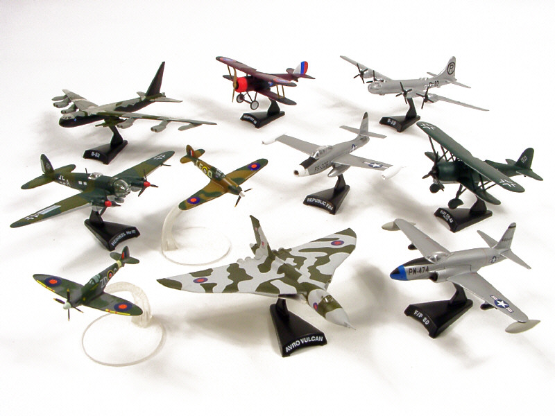 avec socles de présentation - miniatures reproduisant les appareils : REPUBLIC F84, FIAT CR.42 FALCO, AVRO VULCAN, NIEUPORT 28, BOEING B-29, BOEING B-52, F/P 80 & HEINKEL 111 - un SUPERMARINE SPITFIRE & un HURRICANE de marque CORGI-TOYS