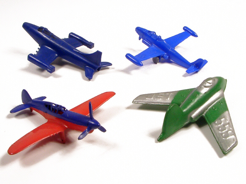 3 modèles en plastique & un en caoutchouc - on y retrouve les marques WANNATOYS, RENWAL & ARCUR TOYS - manque un train d'atterrissage sur un appareil