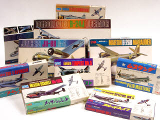 miniatures reproduisant les appareils : fabrication des années 1980 - MESSERSCHMITT ME110, P47D, HAWKER TEMPEST, P51D, GRUMMAN AVENGER, SPITFIRE, JUNKERS JU 88, B24, B25 & B26 - une boîte en état 'e'