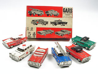comprend : un break de dépannage, une ambulance, un pick-up, une voiture de pompier, une berline & un cabriolet - moteurs à friction (fonctionnent) - includes: a break-down vehicle, an ambulance, a pick-up truck, a fire car, a cabriolet & a berline - friction powered (in working order)