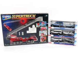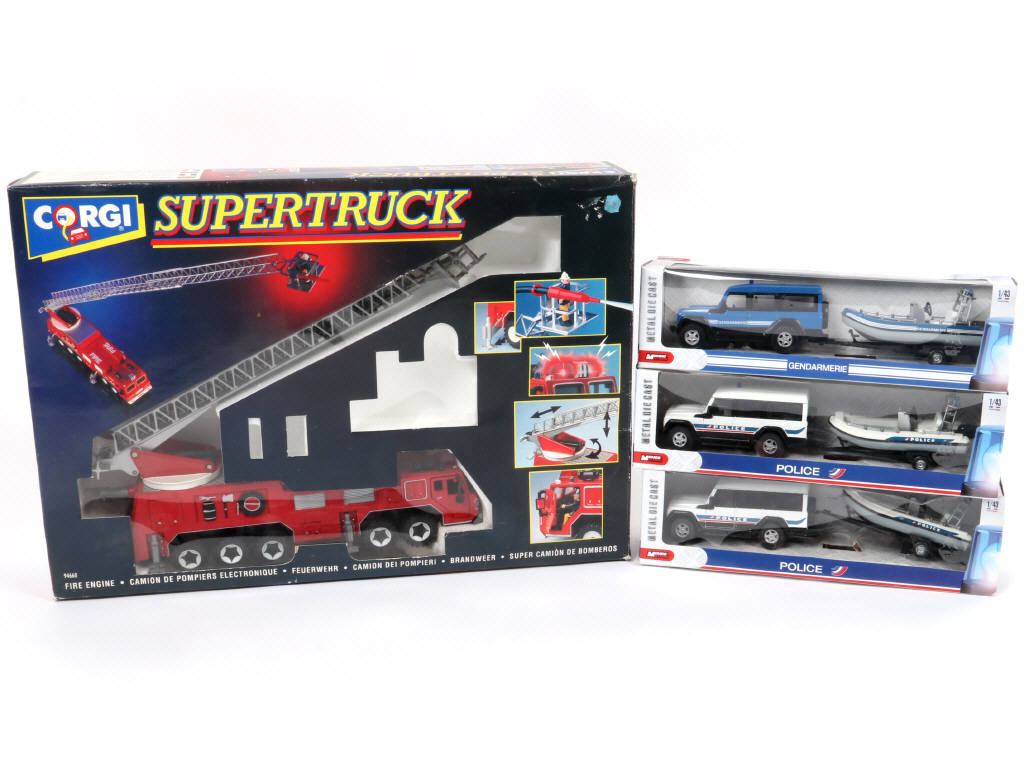 comprend : coffret SUPERTRUCK éléctronique réf : 94660 & 3 véhicules (gendarmerie & police) avec remorques réf : 53151 - on y retrouves les marques CORGI TOYS & MONDO MOTORS
