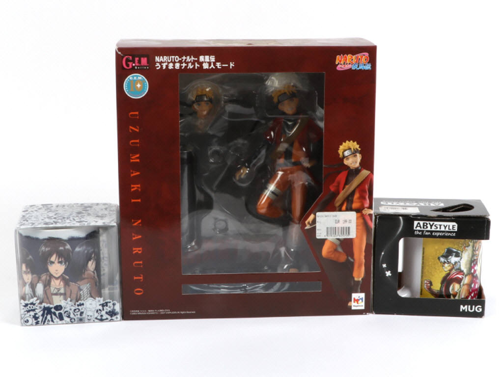 comprend : les mugs DREAMLAND LUCKY STAR & L'ATTAQUE DES TITANS & figurine en PVC NARUTO SENNIN MODE (boite ouverte) - on y retrouve les marques MEGAHOUSE, ABYSTYLE & GATAKA - possibilité de petits manques & parties cassées