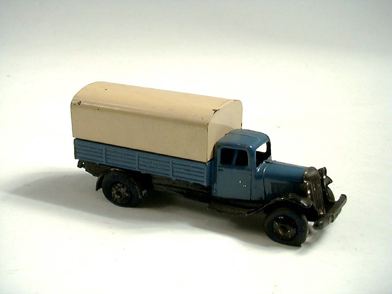 DINKY TOYS (FRANCE) 25B Camion bâché (version d'avant-guerre avec roues à pneus 'DUNLOP') bleu, châssis noir, bâche crème