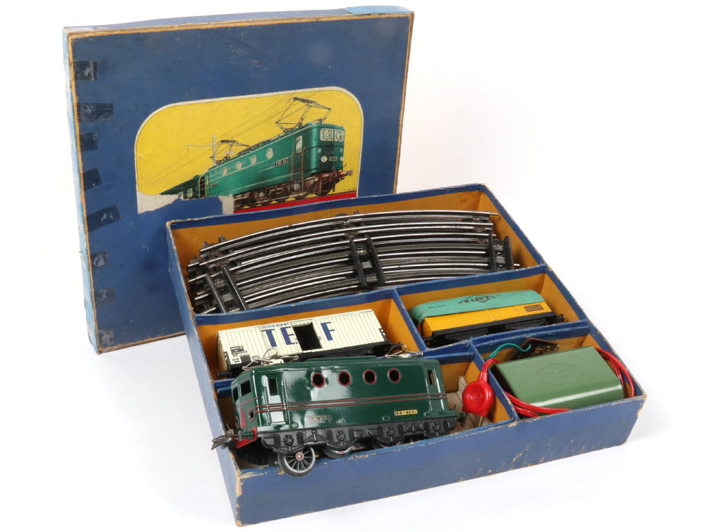 non testé - dimensions : 38 x 36 cm - contient : motrice BB 8051 (quelques petits enfoncements sur la carrosserie par endroits), wagon frigorifique 'STEF', bâché 'SAINT-FRERES', transformateur & 12 rails courbes (ternis) - illustration de coffret incomplète (parties restaurées & non d'origine)