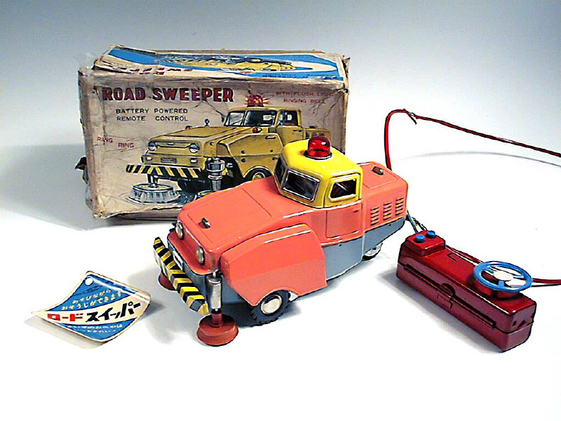 battery toy filoguidé - fonctionne en marche avant & arrière, mais avec direction défectueuse - l'ampoule de toit clignote - le véhicule est équipé d'un réel système de ramassage - étiquette estampillée d'origine - TRES BEAU JOUET !
