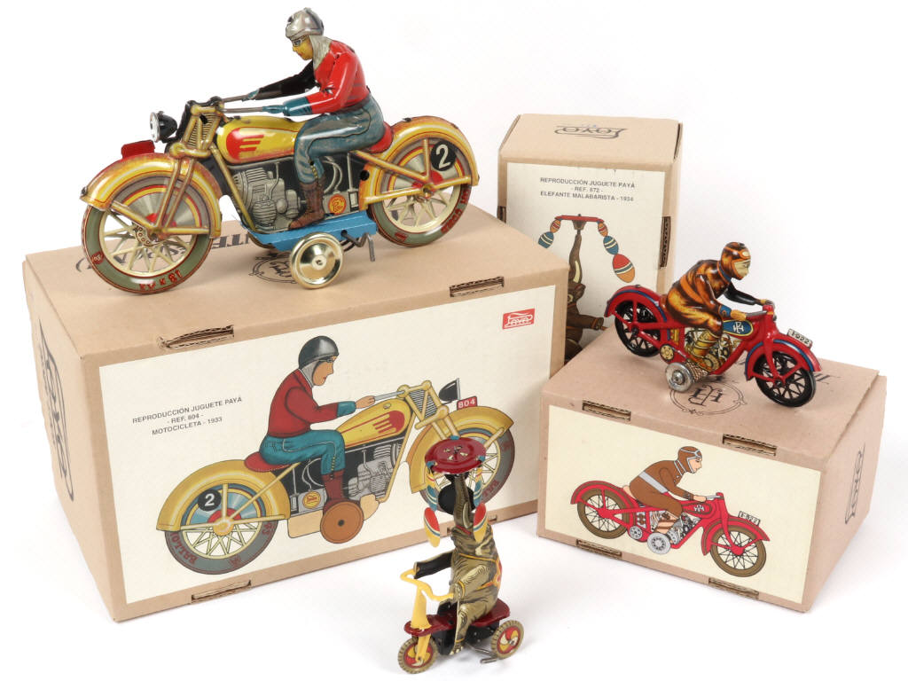 PAYA (ESPAGNE) Ensemble de 2 motos & un éléphant sur tricycle en tôle lithographiée