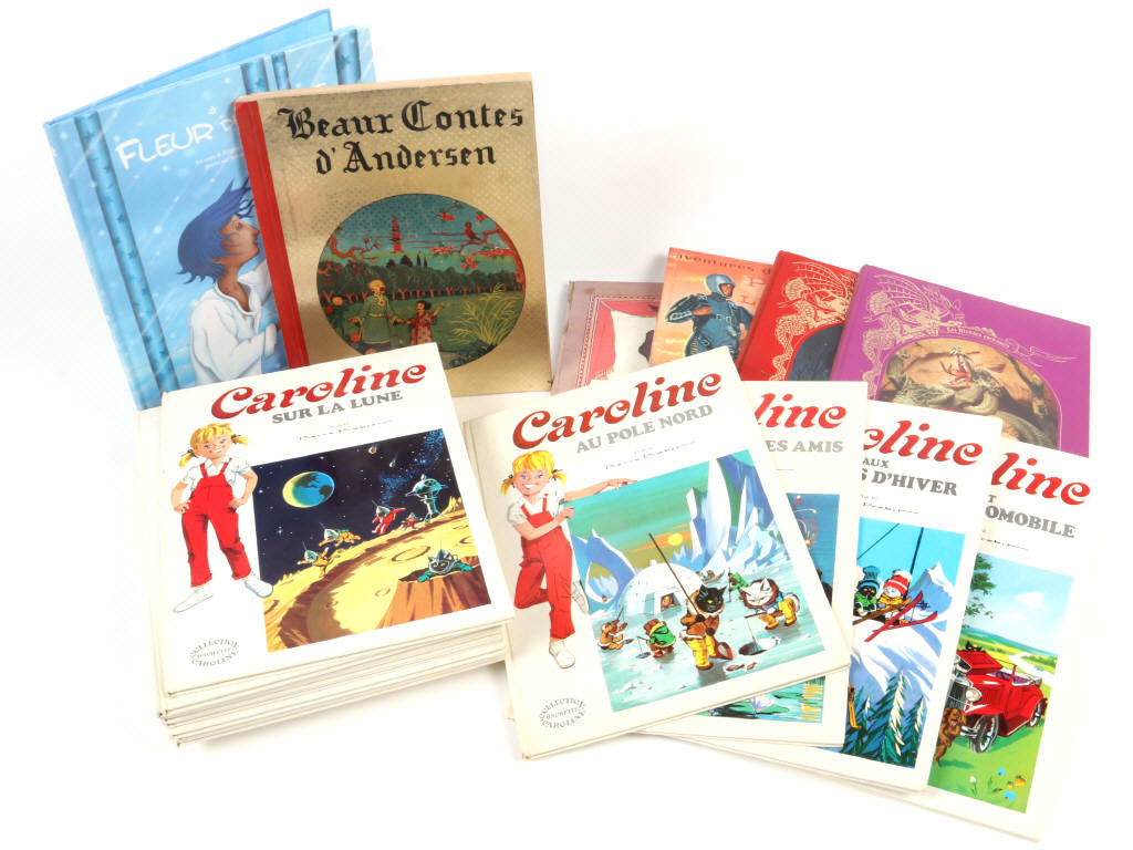 on y retrouve notamment : 15 albums CAROLINE des années 1970 en très bel état, livres de contes, un très beau livre récent FLEUR DE NEIGE & PILOTES DE L'ESPACE - possibilité de petites déchirures & traces d'usure