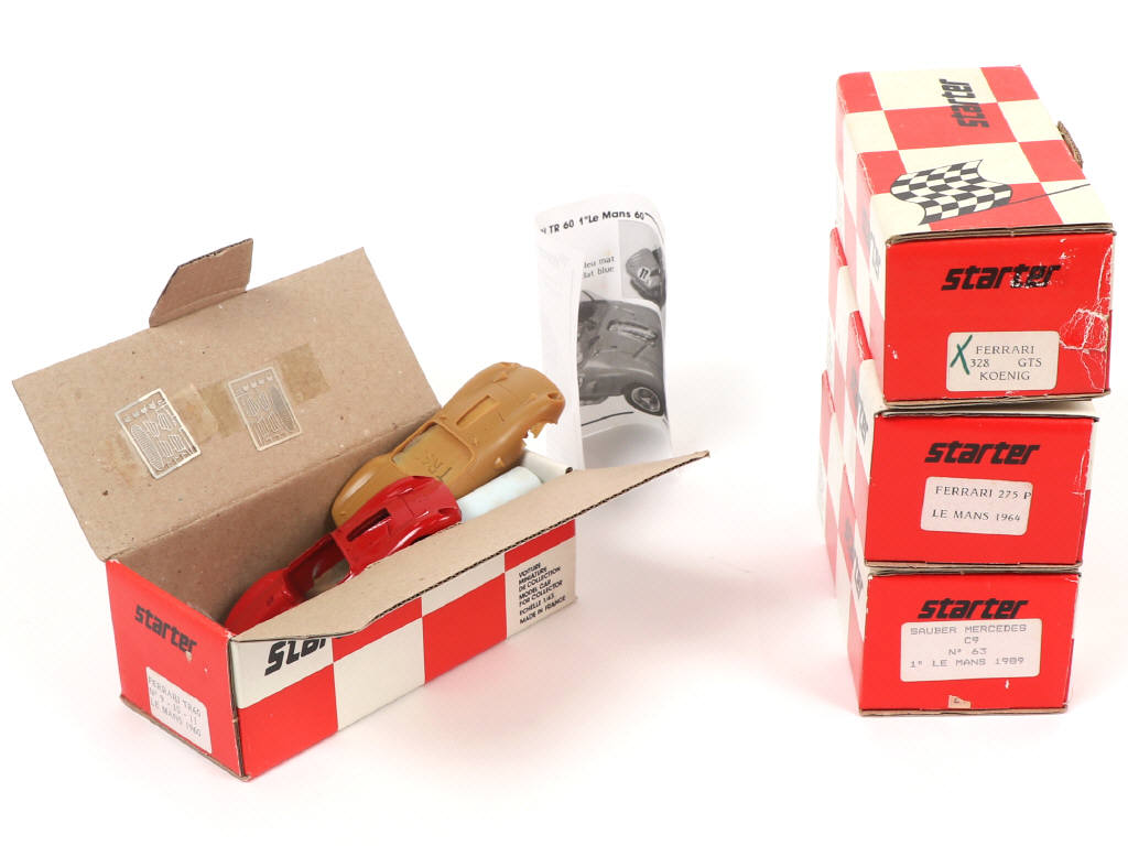 kits en résine à monter (semblent complets) - sans notices - on y joint une FERRARI 'KEONIG' & une TR60 peinte de couleur rouge - 2 boîtes en état 'b' & 2 autres en état 'c'