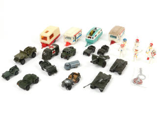 on y retrouve notamment les marques : DINKY TOYS, MAJORETTE & C.I.J - on y joint 6 figurines & un porte-clef PEUGEOT