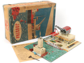 dimensions : 37 x 25 cm - avec moteur à clef & mécanismes (fonctionnent), clef, plateforme, phare électrique (non testé, manque coupole) & notice - importantes déchirures sur la boîte (jaunie)