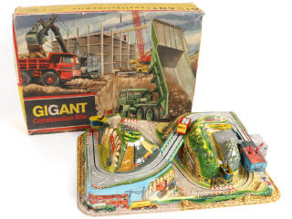 dimensions : 55 x 38 x 12 cm - incomplet - contient : un circuit en plastique motorisé (moteur à piles non testé), un camion de chantier & des billes en plastique - boîte déformée, déchirée & avec accrocs
