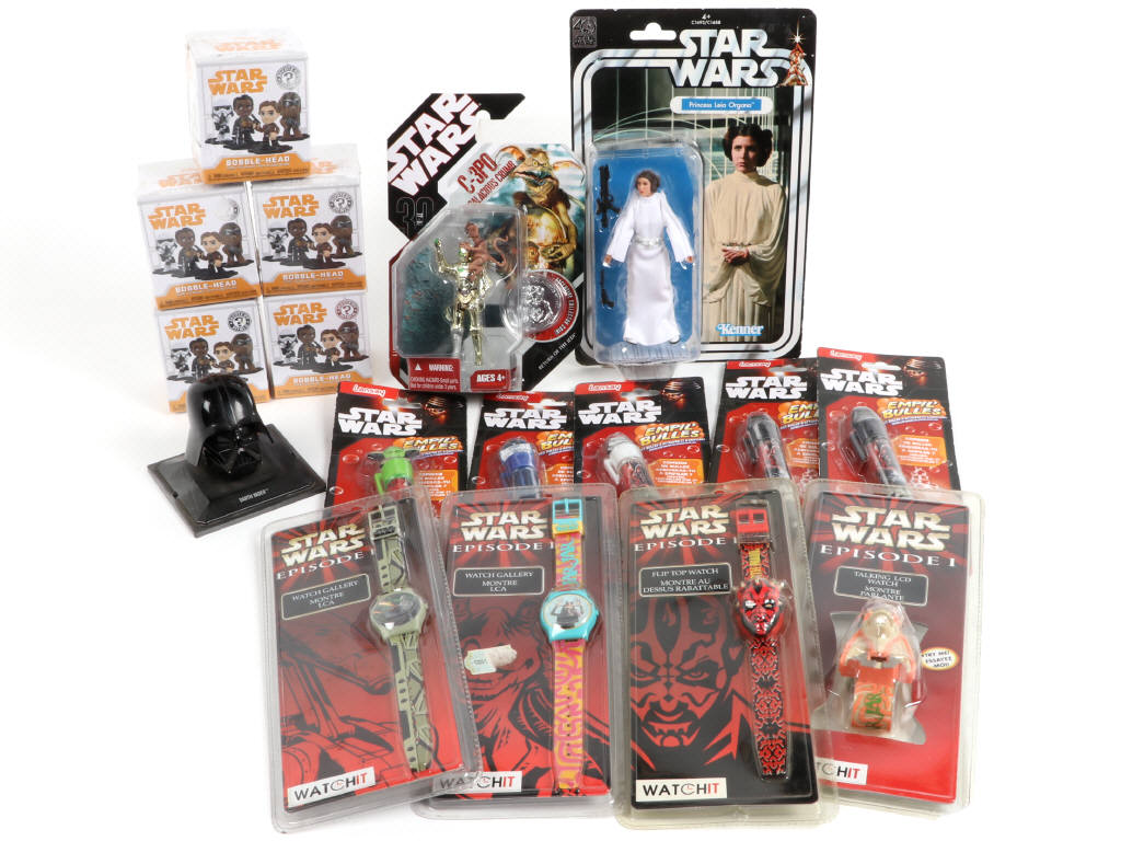 contient : PRINCESS LEIA ORGANA (moderne), C-3PO & SALACIOUS CRUMB - jamais ouverts (un exemplaire avec blister légèrement décollé - on y joint 4 montres de marque WATCHIT, 5 EMPIL' BULLES de marque LANSAY, 5 MYSTERY MINIS BOBBLE-HEAD de marque FUNKO (jamais ouverts), & une statue Darth Vader (légèrement encrassée) - états des boîtes 'a' à 'b'