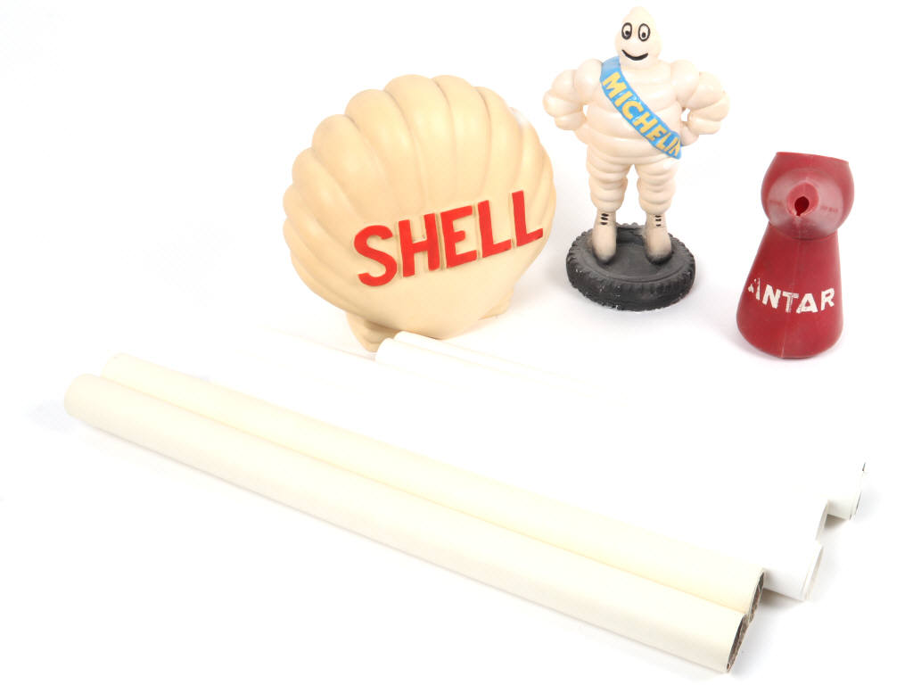 réalisation en plastique - testé (fonctionnelle) - décolorée & tachée par endroits - on y joint un bibendum 'MICHELIN' (réalisé en plâtre), 3 affiches représentant les voitures de course & un pichet de garage 'ANTAR' (incomplet)