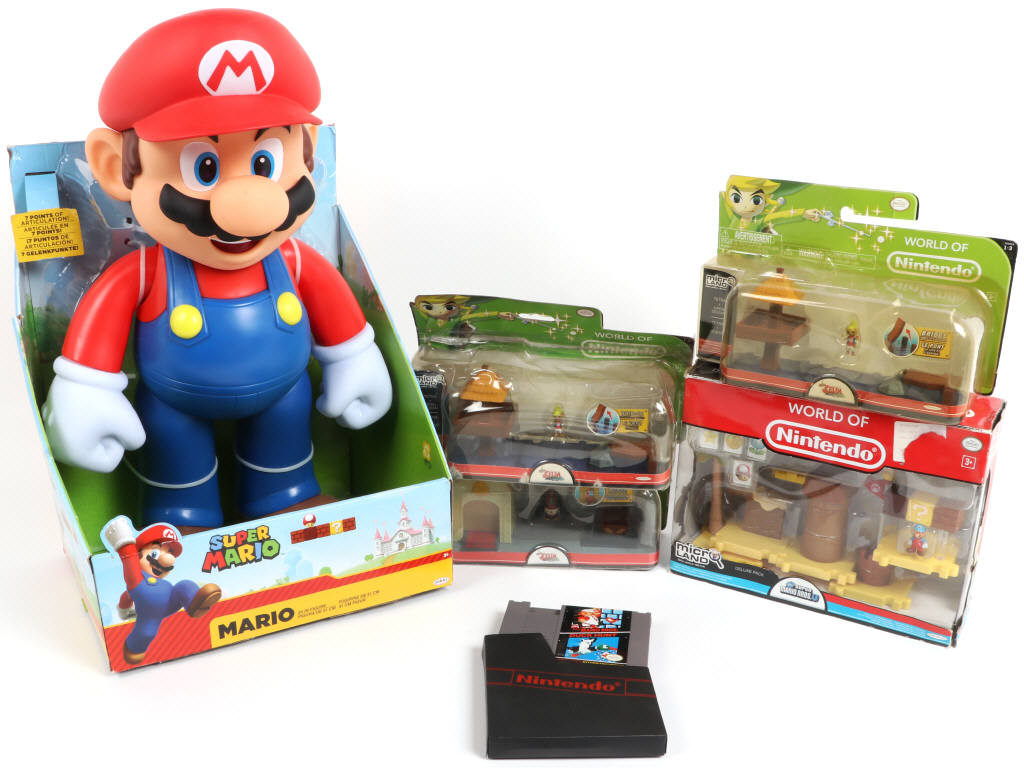 dimension : 51 cm - légèrement encrassé - on y joint 4 MICRO LAND de la marque, (ZELDA & SUPER MARIO BROSS) & une cartouche de jeu NES (comprenant SUPER MARIO & DUNK HUNT, non testé) - boîtes en états 'b' à 'c' (avec accrocs & déformées par endroits)