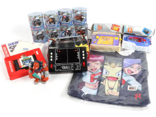 jamais ouverts - on y joint un jeu électronique BLIP de marque TOMY (testé, fonctionnel), une cartouche de jeu NHL ALL-STAR HOCKEY de marque SEGA (non testé), 2 jeux de poches mécaniques à remonter PIN BALL & LUCKY BALL de marque BLUE-BOX (testé fonctionnel), un sac POKEMON (jamais ouvert) & une figurine BUCKY O HARE BRUISER BRUCE LE BABOUIN de marque HASBRO - boites en états de 'a' à 'c'