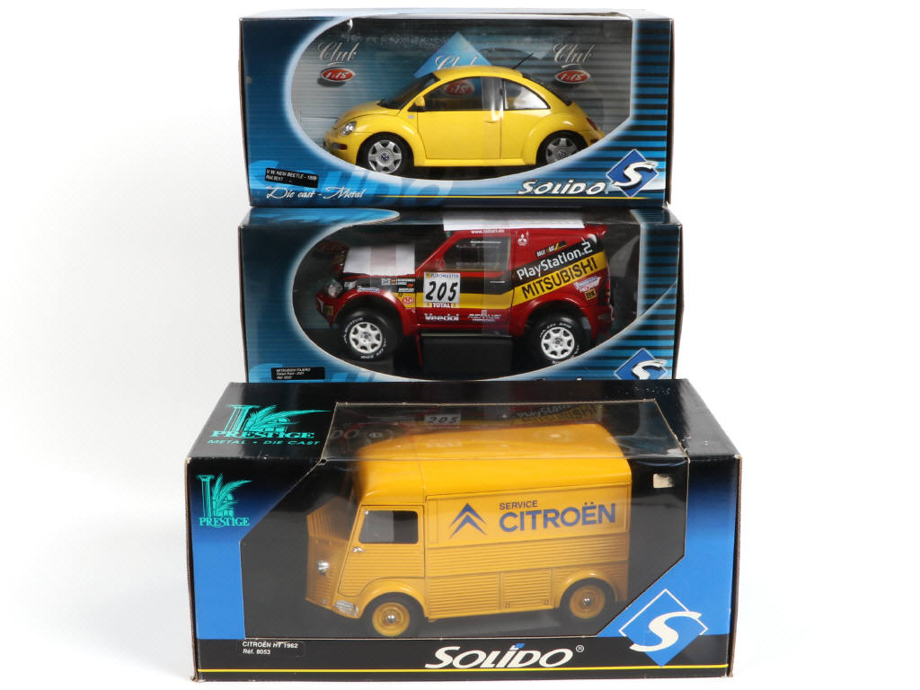 échelle 1:18 - comprend les modèles : MITSUBISHI PAJERO Rallye Raid 2001, CITROÊN HY 1962 & V.W NEW BEETLE 1999 - boîtes avec quelques petits frottements par endroits