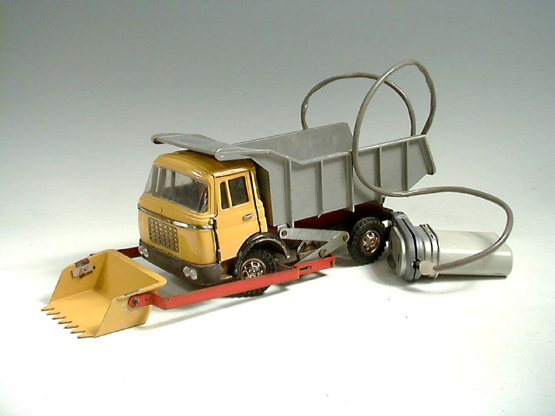 longueur 37 cm - un ingénieux mécanisme permet le levage du godets & le basculement de la benne (à revoir)