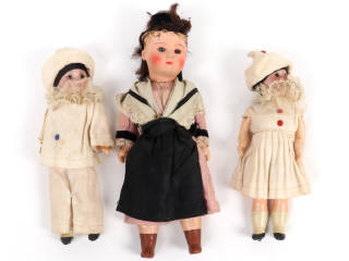 Taille : de 17 à 19 cm - comprend : petite poupée SFBJ (tête en composition, perruque abimée) & couple d'arlequins marqués M 5/0 en bon état général