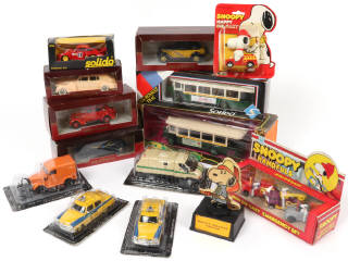 différentes échelles - on y retrouve notamment les marques : SOLIDO (les autobus sont des exemplaires promotionnels) & REXTOYS - les boîtes sont en états 'a' à 'c' - on y joint une figurine SNOOPY