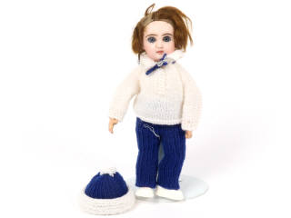 hauteur 24 cm - avec tête en biscuit marquée 'TETE JUMEAU 1' yeux bleus fixes, oreilles percées (quelques petits éclats), bouche fermée & corps articulé en composition (calotte non d'origine) - un doigt cassé & manquant - la poupée est accompagnée d'habits récents