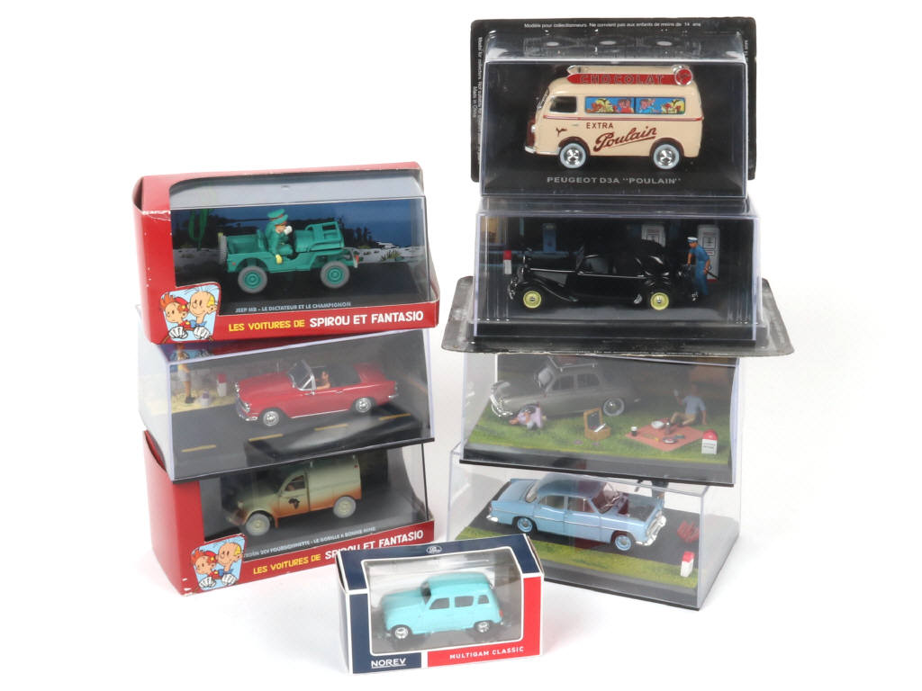 on y retrouve notammenbt les marques : NOREV, ALTAYA & EDITIONS ATLAS - un personnage désolidarisé - une voiture en état 'B' avec capot-moteur manquant & une autre avec une fixation d'axe de roues cassée
