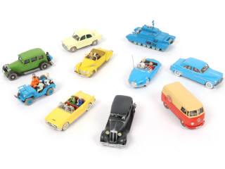 collection 'EN VOITURE TINTIN' - un exemplaire en état 'C' avec importantes traces de métal fatigue par endroits & un autre en état 'A-' avec craquelures de peinture sur le toit, rétroviseurs cassés & manquants - trés légères déformations sur certains accessoires - on y joint une TURBO RHINO 1 'SPIROU' de la marque & un char lunaire non d'origine