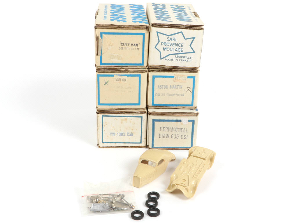 semblent complets (2 exemplaires avec notices & 2 avec carrosserie peinte) - réalisations en résine & plastique - on y joint un kit de la marque DEVOS & CULT CAR - boîtes avec légers frottements, accrocs, déchirée & tachées par endroits (2 non d'origines, état de 'a' à 'c')