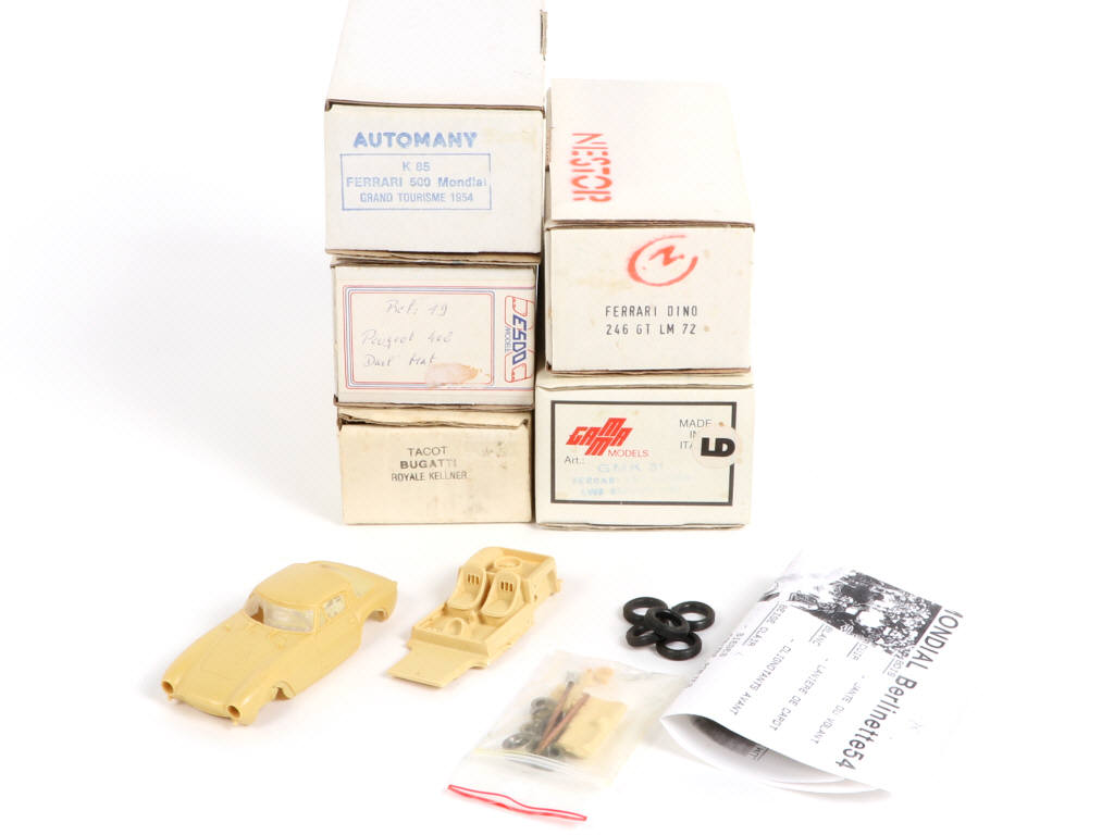semblent complets (3 exemplaires avec notice) - réalisations en résine, plastique & white métal - on y retrouve notamment les marques : TACOT & AUTOMANY - boîtes avec légers frottements, accrocs & tachées par endroits (états de 'a' à 'b')